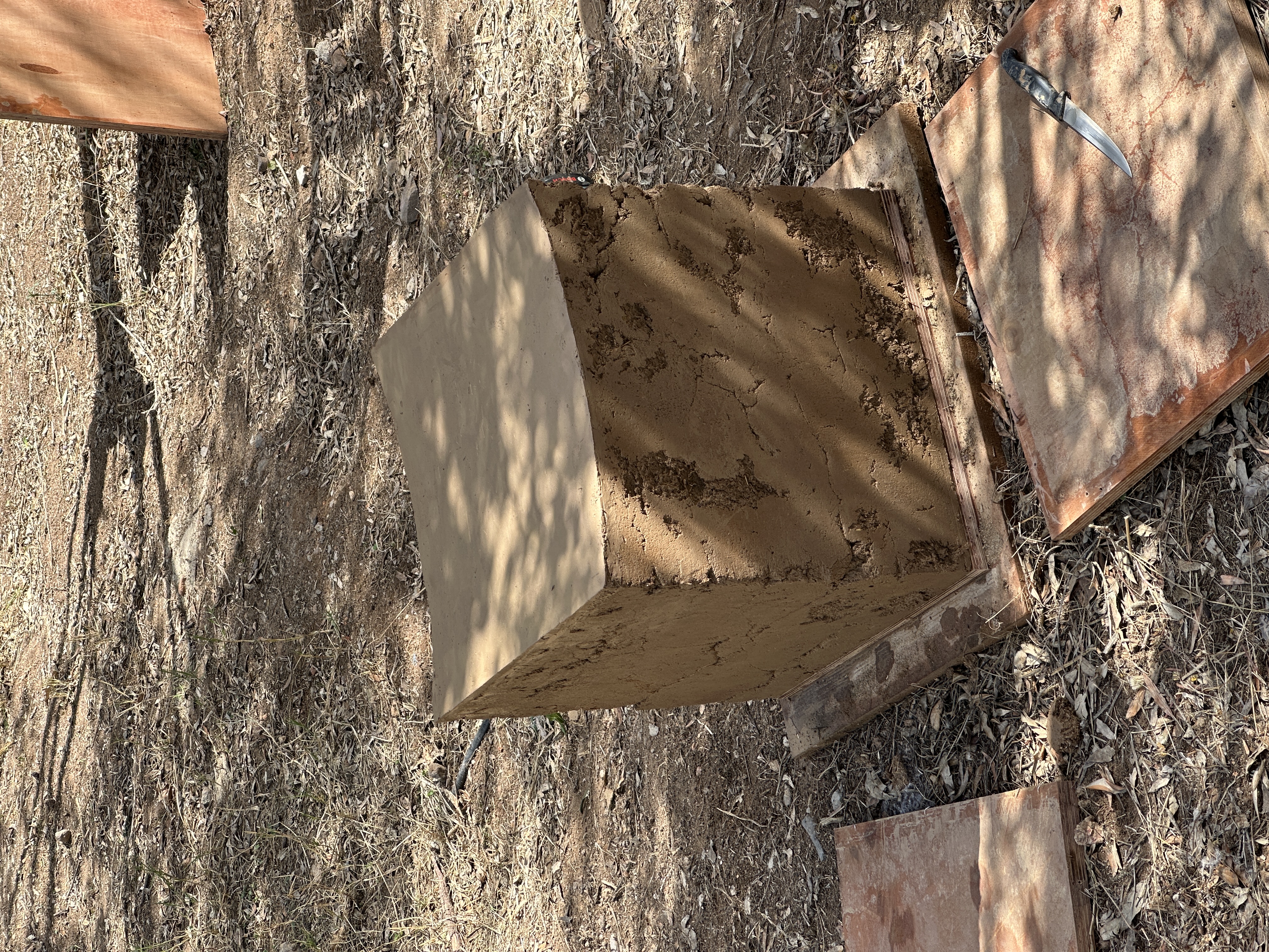 In one day we rebuild the form, slightly smaller this time. I am aware that this is again far too rapid, but I follow my instinct that the hot sunlight + the fibre will hold it in place this time. If it falls again, I will accept. Working with mud is localised and there is only so much research I can apply, the rest is felt and learned through direct contact with this material. The raw material informs me, it speaks through the minds touch, its properties and limitations are communicated through experience and instinct, like an extension of my body.